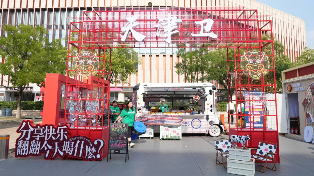 在展位設(shè)計(jì)上,結(jié)合天津地方特色,將中國紅與海河花色奶的“多姿多彩”相融合,創(chuàng)設(shè)“天津衛(wèi)”門頭吸引打卡拍照;搭建翻翻墻,市民可根據(jù)不同話題翻看不同產(chǎn)品,充滿趣味互動(dòng)性。售賣牛奶的牛奶巴士動(dòng)感十足,將牛奶花紋與“哪吒IP”形象相融合,可愛又富有活力。
