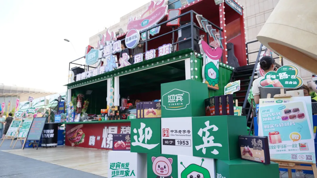作為市集中的另一大亮點(diǎn),以紅綠撞色為主體思路,采用現(xiàn)代集裝箱風(fēng)格,頂部設(shè)置“烤腸”造型,與本次市集迎賓的主打新品“爆肉脆烤腸系列”前后呼應(yīng),4種口味滿足大眾味蕾。歌手每日演出精彩不停,讓消費(fèi)者在音樂中享受美食,游戲區(qū)和休閑區(qū)等多個(gè)打卡點(diǎn)吸引消費(fèi)者眼球。此外,迎賓與百事攜手聯(lián)名打造了跨界不越界的冰火效果,提高了迎賓的品牌知名度,迎賓與百事將以此為契機(jī),穩(wěn)步推進(jìn)深度合作。