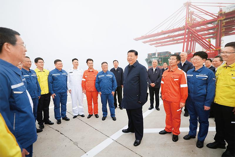 2024年5月22日至24日,中共中央總書記、國家主席、中央軍委主席習(xí)近平在山東考察。這是22日下午,習(xí)近平在日照港親切慰問港口科技工作者、運營人員、航運人員。 新華社記者 鞠鵬/攝