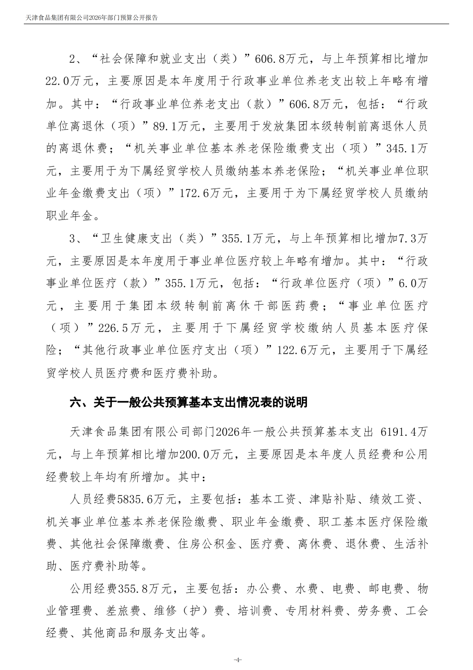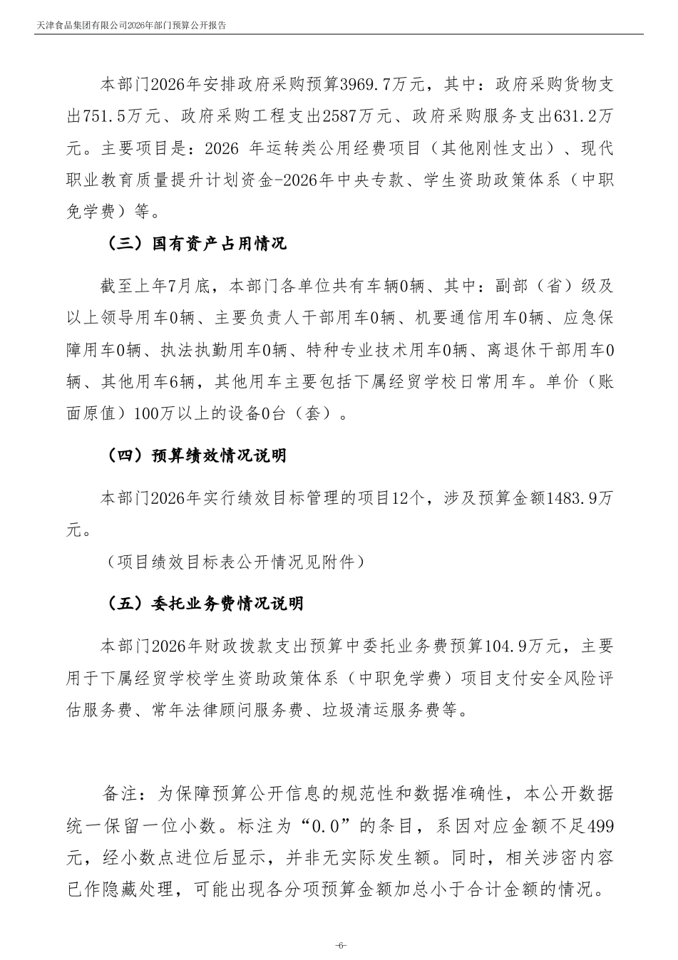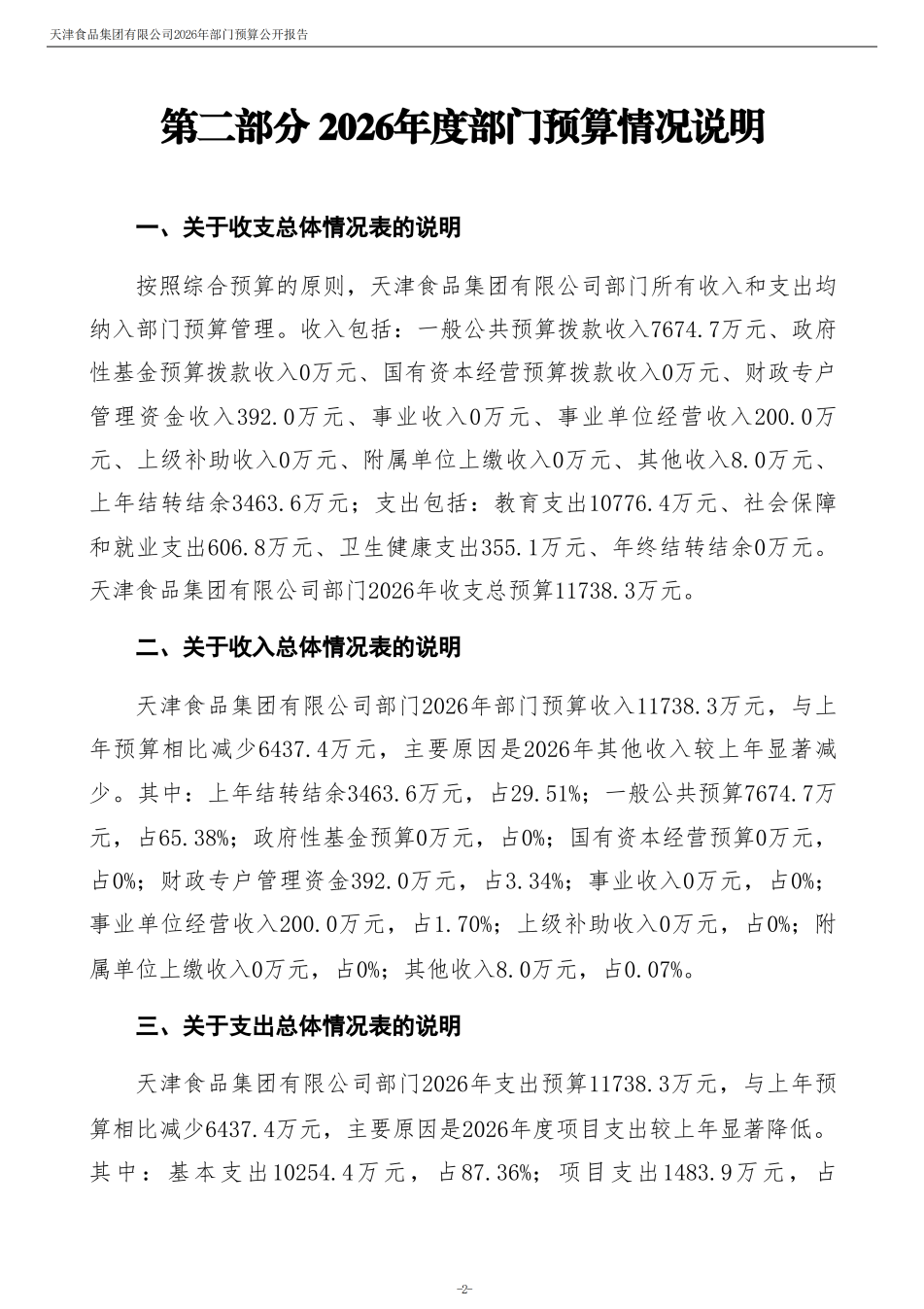天津食品集團有限公司2026年度部門預算